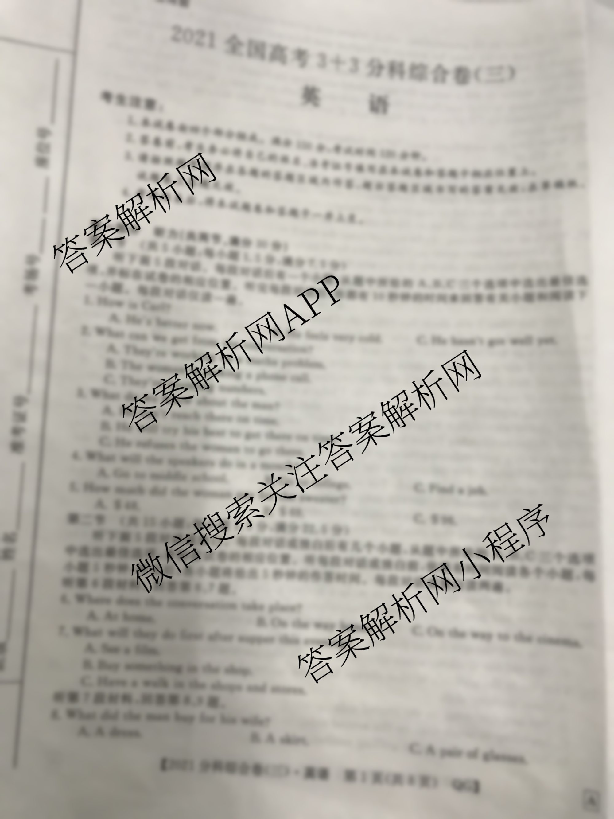 2021全国高考3+3分科综合卷(三)英语试题由衡中同卷整理,获取更多3+3分科综合卷答案解析,请在各大应用商店搜索下载答案解析网APP。
